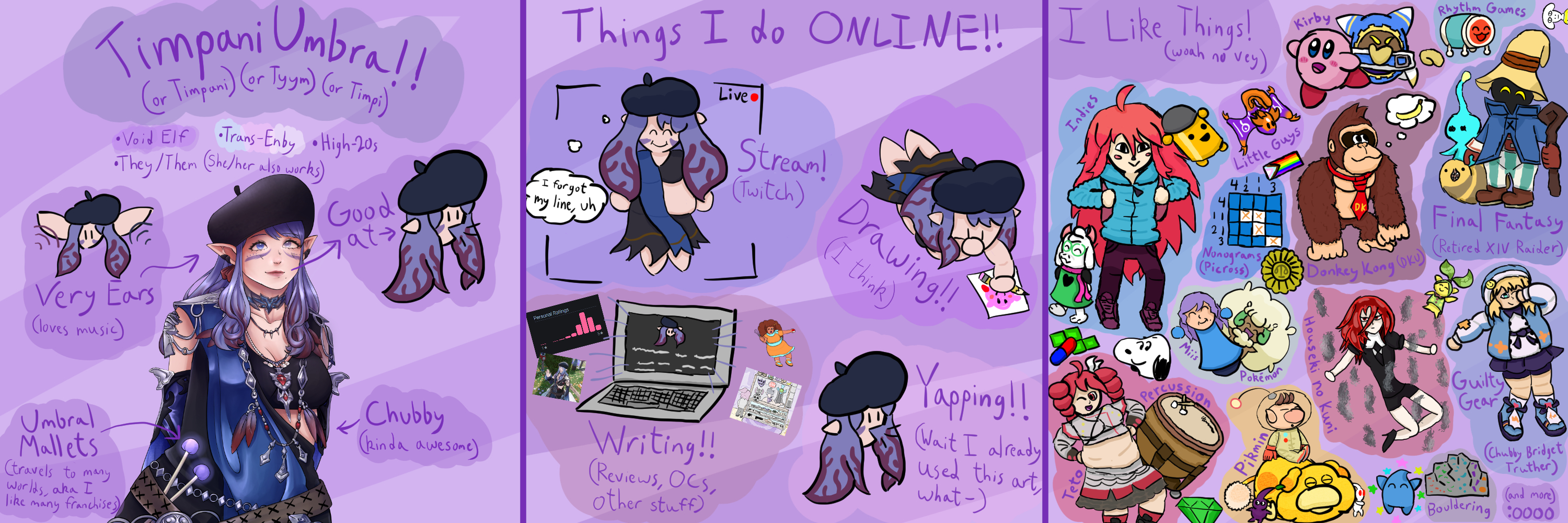 I’m Timpani (They/She), or TimpaniUmbra! I play bideo games, and somehow that’s managed to snowball into an expansive concert of streaming, friends, art, and maybe a little storytelling!