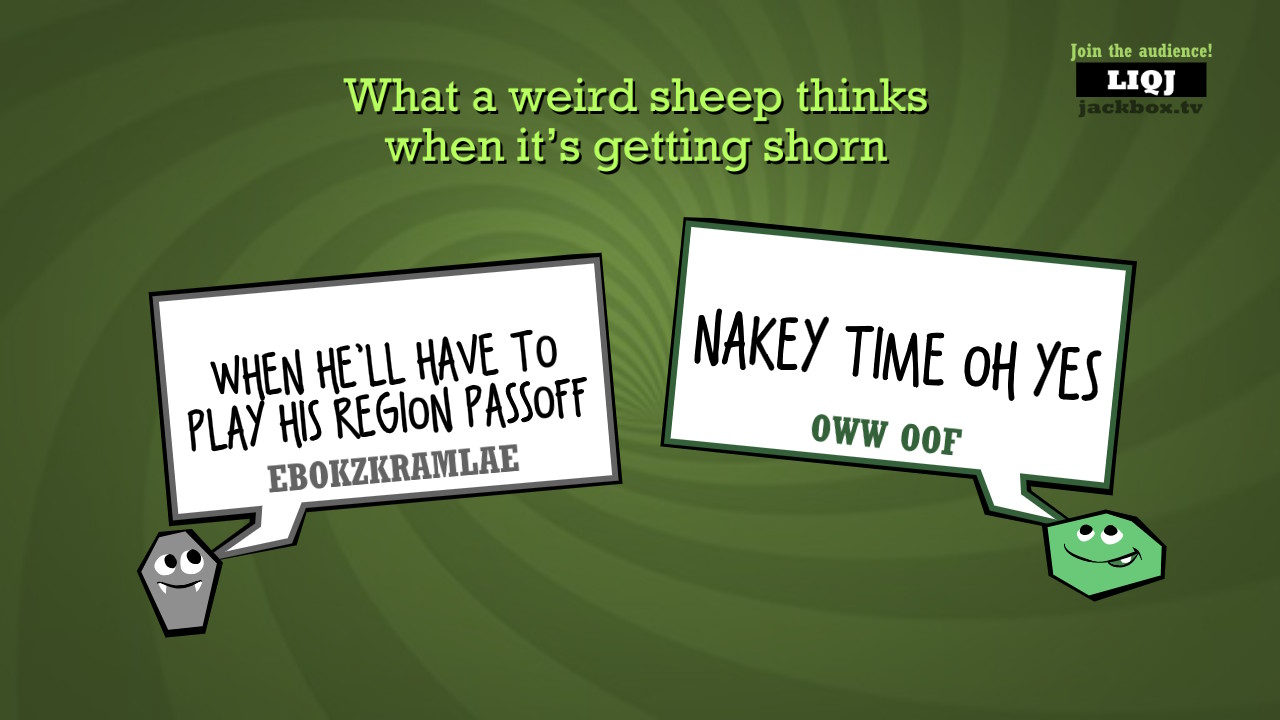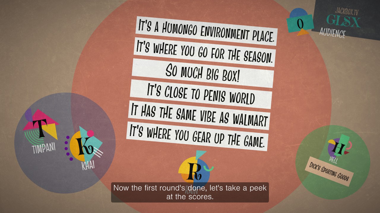 A lot of Jackbox games thrive on the idea that you can, with reason, add nonsense and gibberish to support your humor. You never HAVE to, and you shouldn’t ALWAYS do that, so when you do it sticks out better. This game is entirely based on gibberish and nonsense to such a degree that you can’t figure out what you’re supposed to be doing, and it’s never really funny or clever. It’s not fun.